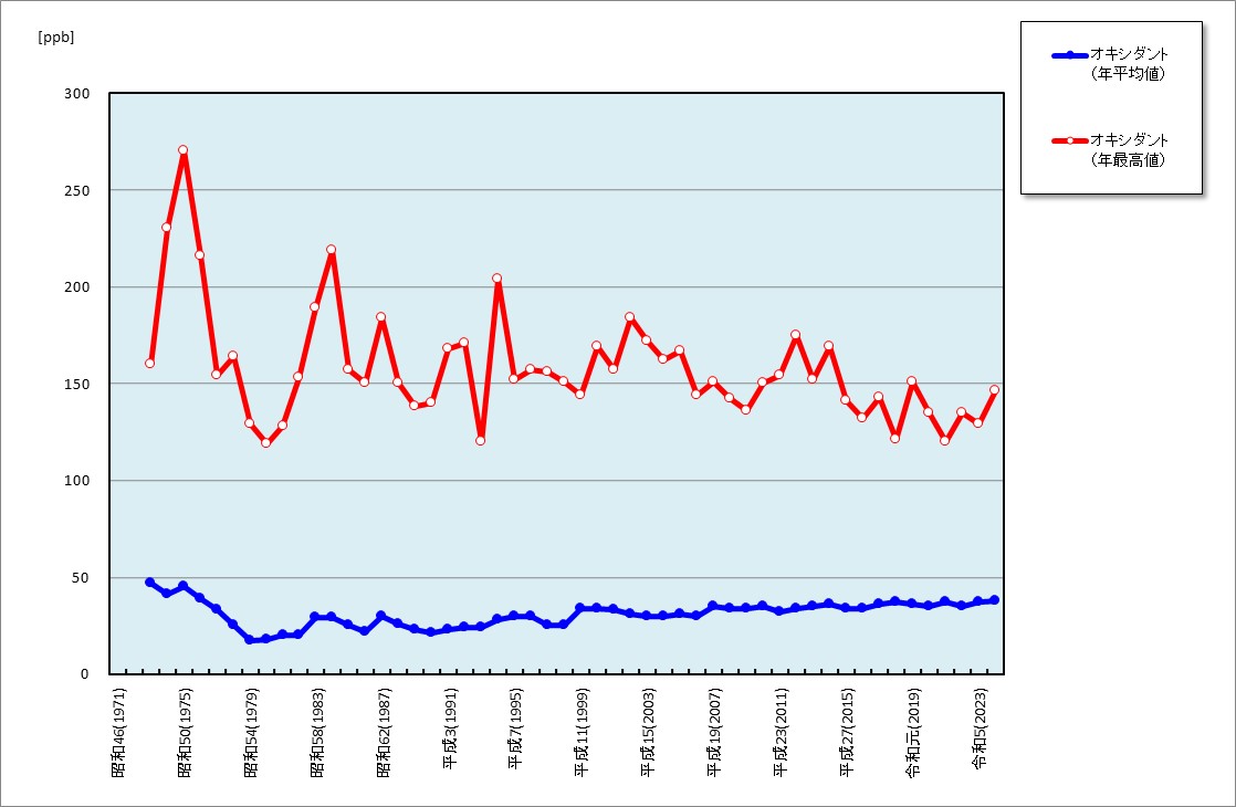| 昼間測定日数(日) | 昼間測定時間数(時間) | 年平均値(ppb) | 1時間値の最高値(ppb) | 1時間値が60ppbを超えた時間数(時間) |